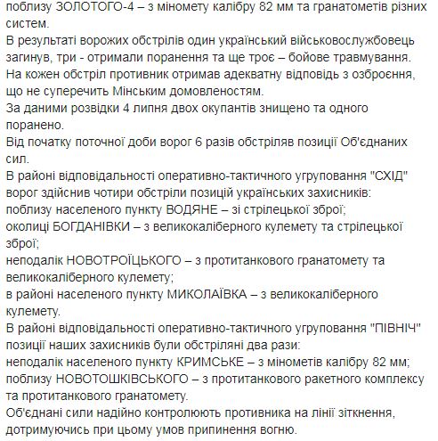 В районе ответственности оперативно-тактической группировки "Север" украинские позиции были обстреляны 14 раз: возле Новгородского, Крымского, Луганского, Новолуганского, Хутора Вольный, Золотого-4, окрестности Новотошковского, Южного, в районе Попасной. По данным разведки, 4 июля двух боевиков убили, один ранен.