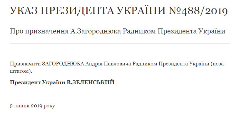 Так, в соответствии с указом Зеленского №488/2019, Загороднюк Андрей Павлович становится советником президента Украины (вне штата).