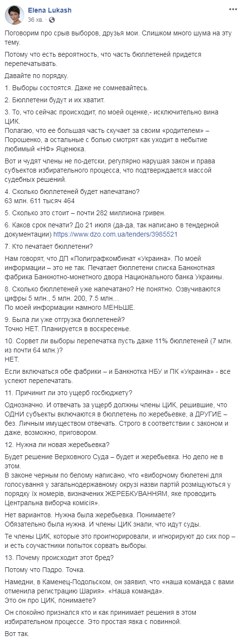 По данным Лукаш, перепечатка даже 11% бюллетеней (7 млн из 64) не сорвет выборы: "Если включатся обе фабрики – и Банкнотка НБУ и ПК "Украина" - все успеют перепечатать". В то же время это нанесет ущерб госбюджету:  "И отвечать должны члены ЦИК, решившие, что одни субъекты включаются в бюллетень по жеребьевке, а другие  – без. Личным имуществом отвечать. Строго в соответствии с законом и даже, возможно, приговором", - пишет Лукаш.