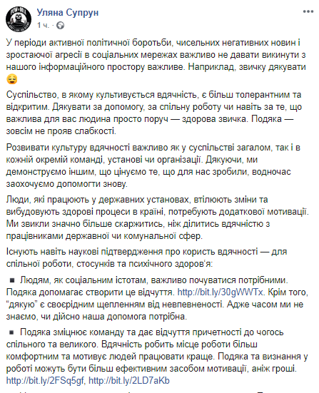 Украинцам стоит не забывать о привычке благодарить, особенно в период активной политической борьбы, многочисленных негативных новостей и растущей агрессии в социальных сетях. Об этом сообщила и.о. главы Минздрава Ульяна Супрун на своей странице в Facebook.