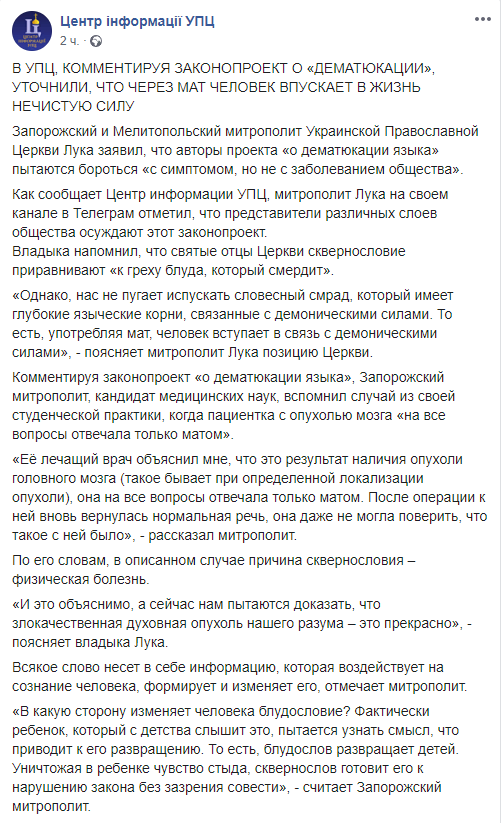 Запорожский и Мелитопольский митрополит Украинской Православной Церкви Лука заявил, что авторы проекта "о дематюкации языка" пытаются бороться "с симптомом, но не с заболеванием общества". Об этом сообщает Центр информации УПУ в Facebook.