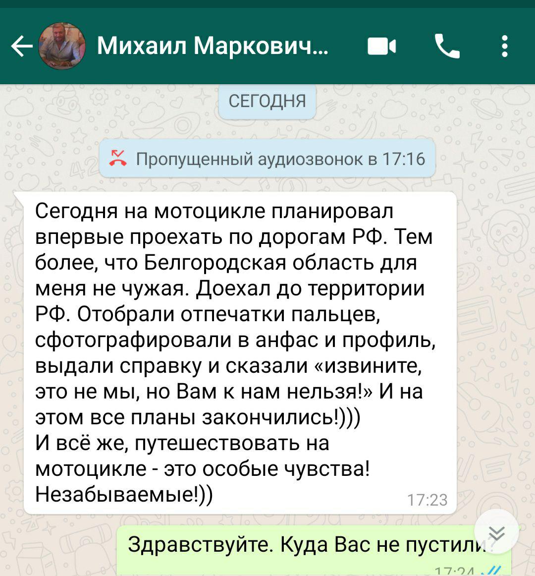 5 июля Михаил Добкин хотел на мотоцикле "впервые проехать по дорогам РФ". На въезде в Белгородскую область нардепа развернули, сфотографировав его в профиль и анфас и взяв отпечатки пальцев.