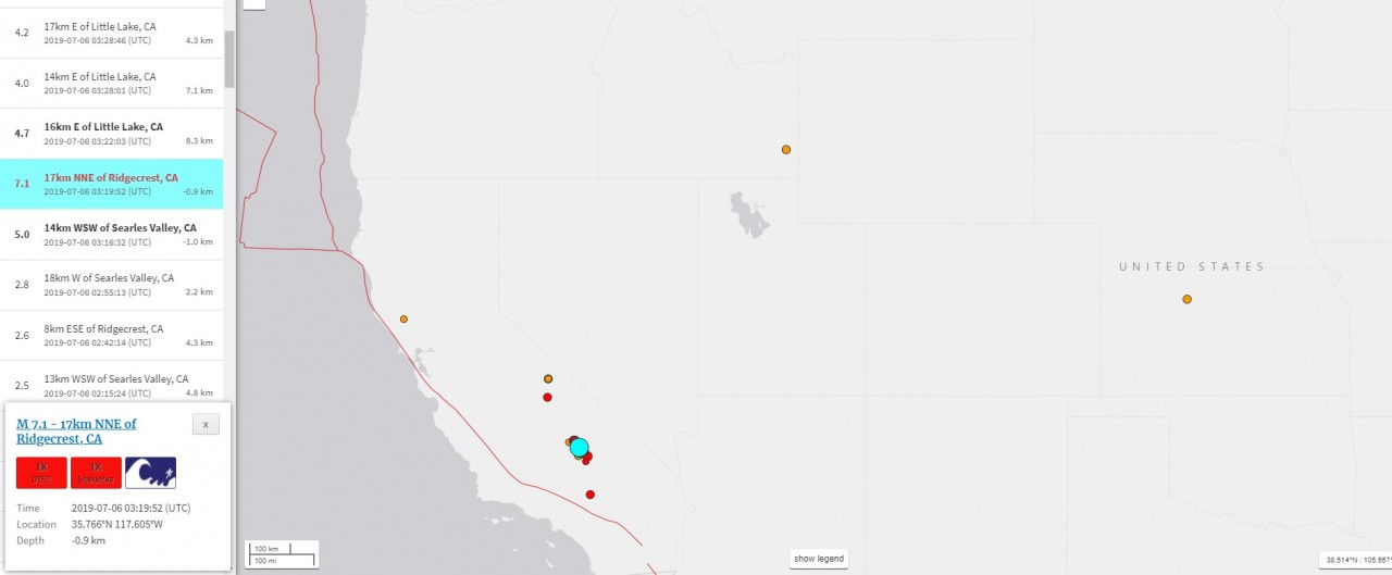 Магнитуда землетрясения достигла 7,1. Его эпицентр находился в 17 км к северо-востоку от города Риджкрест. По данным Европейского Средиземноморского сейсмологического центра, эпицентр находился на глубине 10 км.