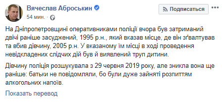 В пятницу, 5 июля, в Днепропетровской области полицейские задержали мужчину, который изнасиловал и убил 14-летнюю девочку. Об этом в Facebook сообщил заместитель главы Нацполиции Вячеслав Аброськин.