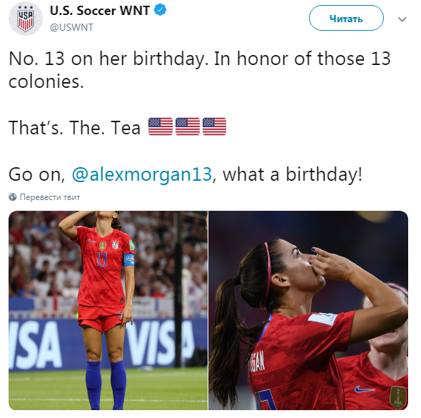 В Федерации футбола США подтвердили, что Морган сделала отсылку к событиям 1773 года. А британские фанаты, в свою очередь, возмутились поведением капитана американской сборной, отмечая, что она проявила неуважение к соперникам.