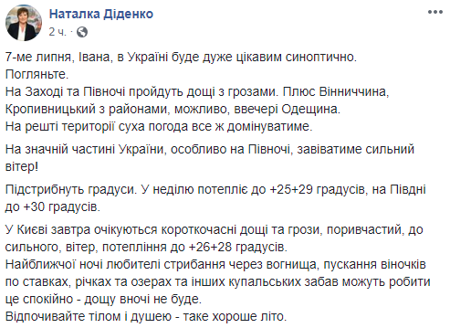 Погода в Украине в воскресенье, 7 июля, будет в целом теплой, но не везде. Жителям некоторых областей следует подготовиться к дождям, хотя купальским традициям ничего не помешает. Об этом сообщает синоптик Наталья Диденко на своей странице в Facebook.