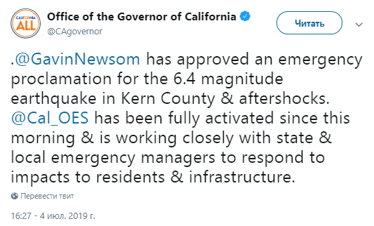В американском штате Калифорния из-за ожидания новых подземных толчков объявили режим ЧП. Об этом в Twitter сообщает офис местного губернатора Гэвина Ньюсома.