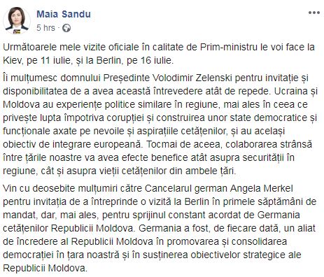 Напомним, 2 июля Майя Санду нанесла свой первый официальный визит в новой должности в Румынию, где встретилась с президентом страны Клаусом Йоханнисом и премьер-министром Виорикой Дэнчилэ.