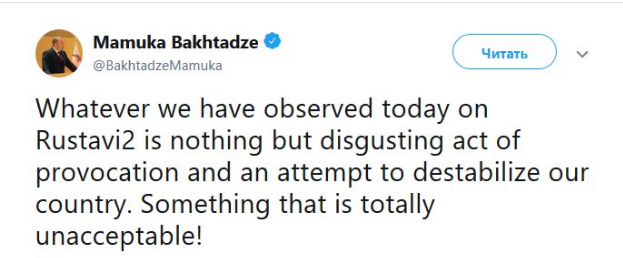 "То, что мы сегодня увидели в эфире телекомпании "Рустави 2", – не что иное, как отвратительный акт провокации и попытка дестабилизации нашей страны. Это полностью неприемлемо", – отметил Бахтадзе.