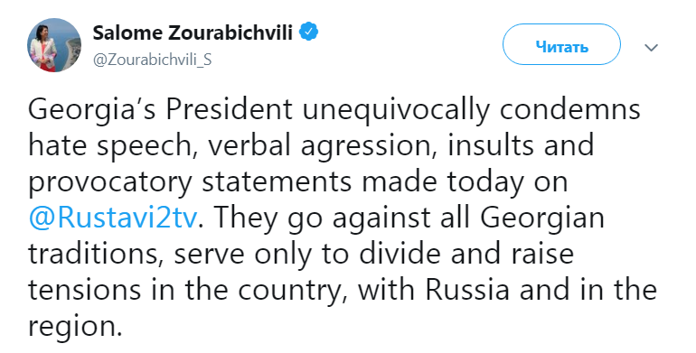 "Президент Грузии однозначно осуждает разжигание ненависти, словесную агрессию, оскорбления и провокационные заявления, сделанные сегодня на "Рустави-2". Они идут вразрез со всеми грузинскими традициями, служат только для разделения с Россией и повышения напряженности в стране и в регионе", – написала президент.