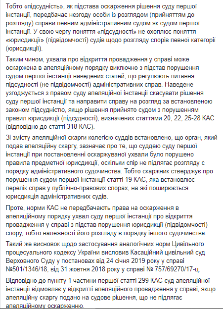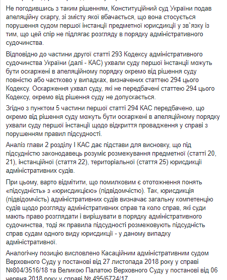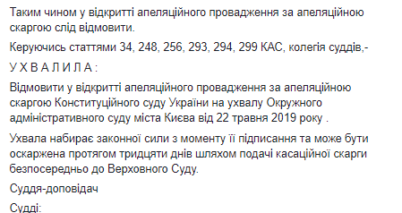 Из сообщения становится понятно, что коллегия судей отказала в открытии апелляционного производства по жалобе Конституционного суда Украины на постановление Окружного административного суда города Киева от 22 мая 2019 года.