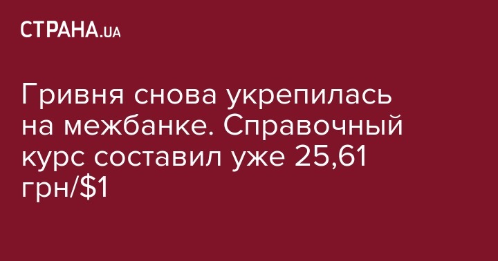 Справочный курс гривни к доллару США на межбанковском валютном рынке по состоянию на 12:00 8 июля 2019 года укрепился до 25,61 грн за единицу американской валюты. Об этом сообщает "Интерфакс-Украина".