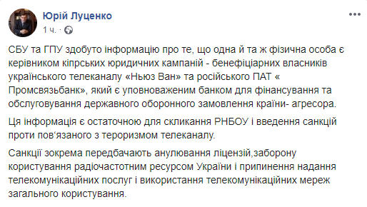 "Нами получена информация о том, что конечным бенефициаром, владельцем NewsOne является кипрская компания, руководителями которой являются соответствующие граждане Республики Кипр. Один из них является одновременно соучредителем другой кипрской компании, которая является совладельцем российского ПАО "Промсвязьбанк", - сказал Луценко журналистам в понедельник.