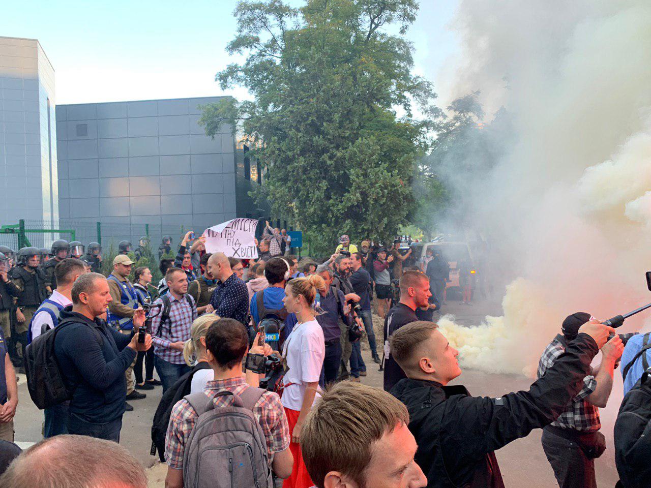 Как сообщает журналист "Страны", у здания канала находятся около трех сотен человек, среди которых члены Нацкорпуса и С14. Националисты жгут фаера, а на территорию комплекса, где расположен телеканал, залетают петарды. На кордоне выстроились бойцы Нацгвардии.