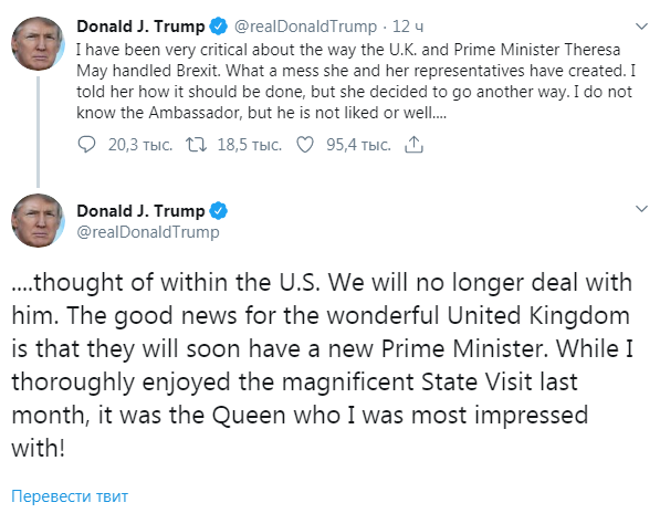 "Я очень критически относился к тому, как Великобритания и премьер-министр Тереза Мэй обращались с Брекситом. Какой беспорядок она и ее представители создали... Я не знаю посла, но в США его не любят и не думают о нем хорошо. Мы больше не будем иметь с ним дело", - написал Трамп.