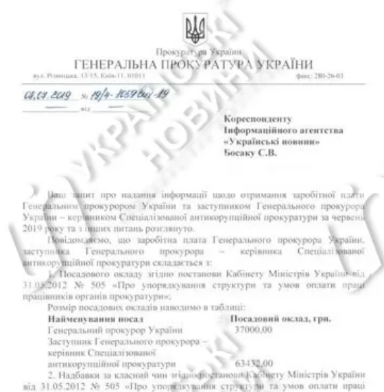 Зарплата указана с учетом надбавок, доплат и премий. Непосредственно должностной оклад замгенпрокурора составил 63 432 гривны.