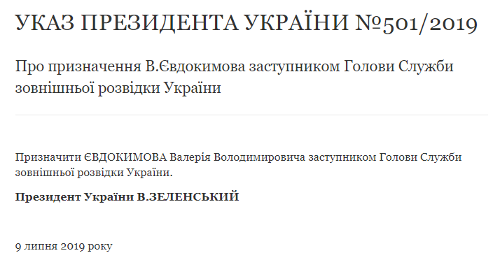 "Назначить Евдокимова Валерия Владимировича заместителем главы Службы внешней разведки Украины", - сказано в документе.