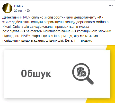 Сотрудники Национального антикоррупционного бюро Украины (НАБУ) совместно с сотрудниками департамента "К" Службы безопасности Украины (CБУ) проводят обыски в помещении Фонда госимущества (ФГИ) Украины в Киеве. Об этом говорится в посте НАБУ в соцсети Facebook во вторник, 9 июля.