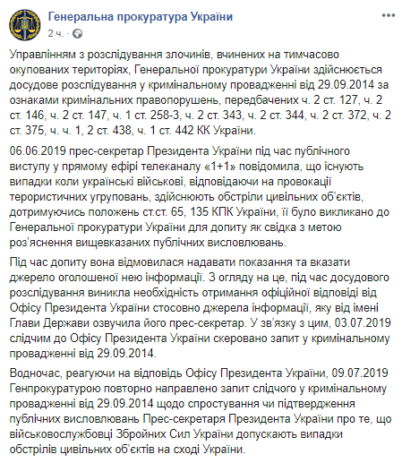 "9 июля 2019 года Генпрокуратурой повторно направлен запрос следователя в уголовном производстве от 29.09.2014 об опровержении или подтверждение публичных высказываний пресс-секретаря президента Украины о том, что военнослужащие ВСУ допускают случаи обстрелов гражданских объектов на востоке Украины", - говорится в сообщении.