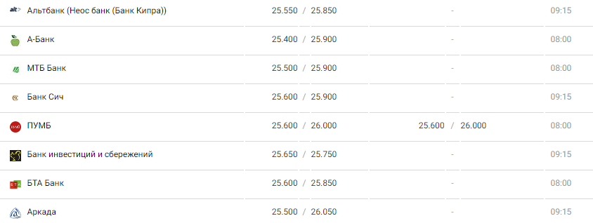 А в банках курс подрос на 5 копеек. Средняя цена продажи в рамках 25,75-25,90 грн была в таких банках, как Приватбанк, Пумб, Укргазбанк, Альфа банк, УкрСибБанк, Универсал банк, Креди Агриколь банк, ОТП банк.