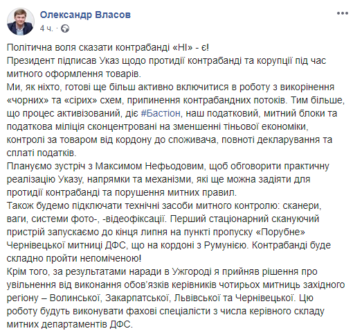 И.о. главы Государственной фискальной службы Украины Александр Власов уволил с постов руководителей таможен Волынской, Закарпатской, Львовской и Черновицкой областей. Об этом чиновник сообщил на своей странице в Facebook.
