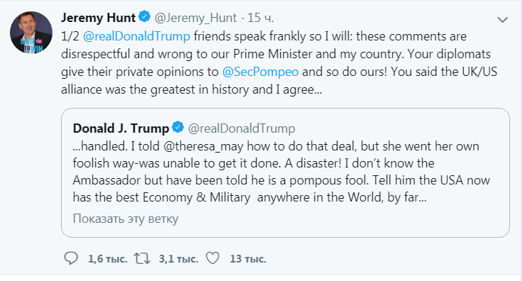 Заявление Ханта стало ответом на выпад главы Белого дома в адрес Терезы Мэй и посла Кима Даррока. В серии твитов Трамп разнес Мэй за ее провальные переговоры по Brexit, а Даррока обозвал "дурацким послом".