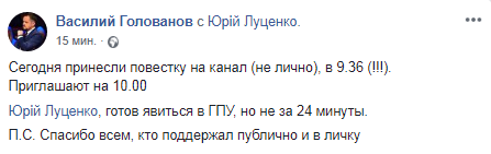 "Юрий Луценко, готов явиться в ГПУ, но не за 24 минуты", - написал Василий Голованов.