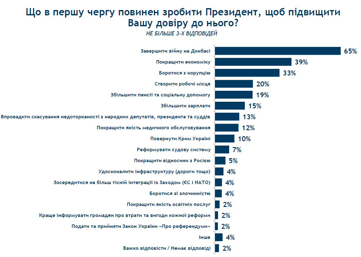 Социологи поинтересовались у респондентов, какие действия президента повысят доверие к нему и чего они ожидают от новоизбранной Рады. И от главы исполнительной власти, и от законодателей граждане Украины ожидают в первую очередь завершения войны на Донбассе (65 и 45% соответственно), улучшения экономики (39 и 34%), борьбы с коррупцией (33 и 30%), а также создания рабочих мест и увеличения пенсий и соцвыплат (около 20% голосов).