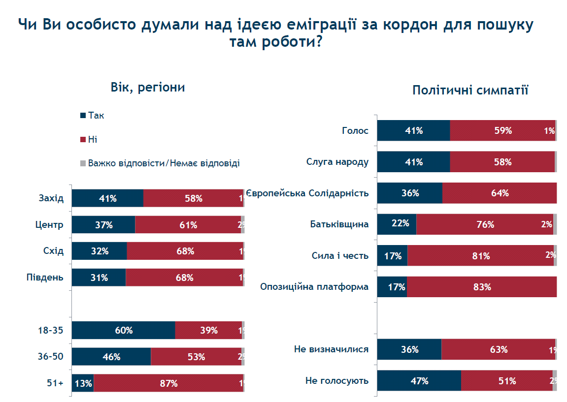 Социологи также выяснили зависимость между желанием уехать за границу для поисков работы, регионом проживания, возрастом, политическими предпочтениями и активностью на выборах. Оказалось, что больше всего об эмиграции задумываются на западе страны - 41%, люди от 18 до 35 лет (60%), а также сторонники "Голоса" и "Слуги народа" (по 41%). Подумывающих об отъезде особенно много в группе тех, кто не голосует на выборах (47%).