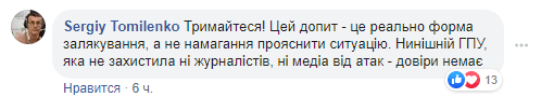 "Держитесь! Этот допрос - это реально форма запугивания, а не попытки прояснить ситуацию. Нынешняя ГПУ не защитила ни журналистов, ни медиа от атак - доверия нет", - написал Томиленко.