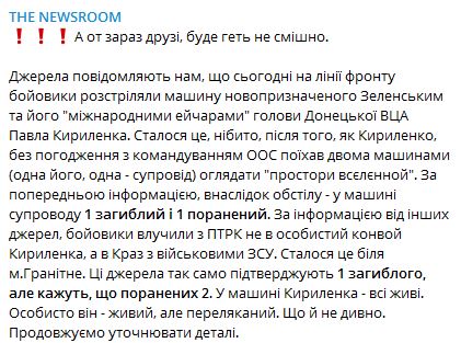 При этом Telegram-канал The Newsroom  сообщает, что под обстрел попало авто из колонны, в которой передвигался председатель Донецкой областной государственной администрации Павел Кириленко без согласования командования. Сам он не пострадал.