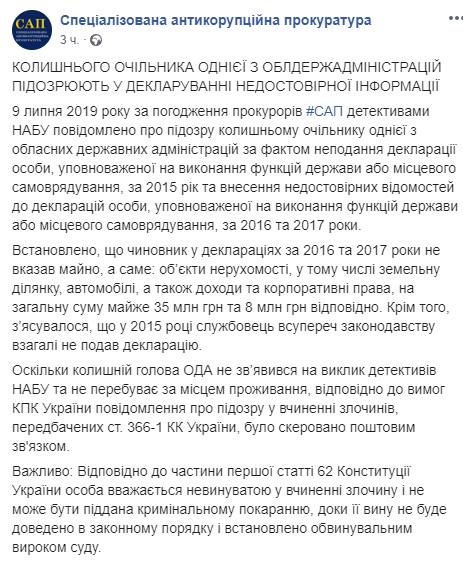 Отмечается, что 9 июля прокуроры САП согласовали, а детективы Национального антикоррупционного бюро объявили чиновнику подозрение. Как утверждает следствие, он не подал декларацию за 2015 год и внес недостоверные данные в декларации за 2016 и 2017 годы.