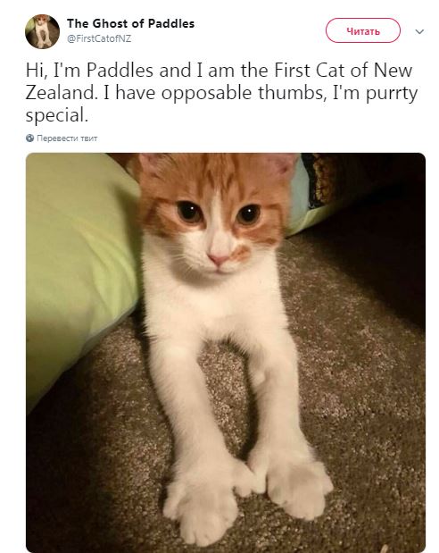 Ардерн взяла животное из приюта. Прозвище Paddles ("Вёсла") ей принесли лишние пальцы на лапах. На ее аккаунт в Twitter подписались 10 тысяч человек. А громким мяуканьем она едва не сорвала телефонный разговор Джасинды Ардерн с Дональдом Трампом.
