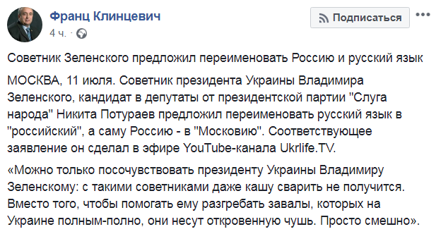 В Российской Федерации быстро отреагировали на слова Потураева. Член Совета Федерации Франц Клинцевич на своей Facebook-странице посочувствовал Зеленскому, вынужденному общаться с помощниками вроде Потураева.