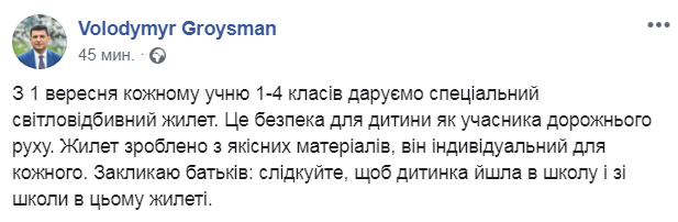 "С 1 сентября каждому ученику 1-4 классов дарим специальный светоотражающий жилет. Это безопасность для ребенка как участника дорожного движения", - написал Гройсман.