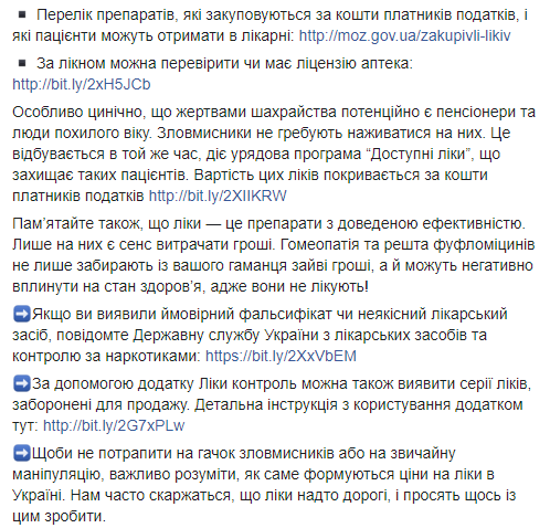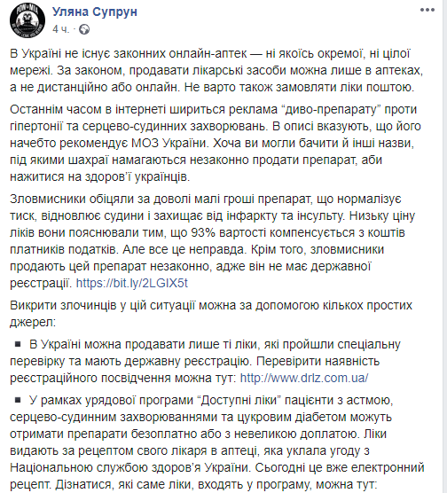 Как пишет Супрун, разоблачить преступников в этой ситуации можно с помощью нескольких простых источников: перечень лицензий, перечень препаратов, которые закупаются за средства налогоплательщиков, и которые пациенты могут получить в больнице. Также можно проверить, имеет ли лицензию аптека.