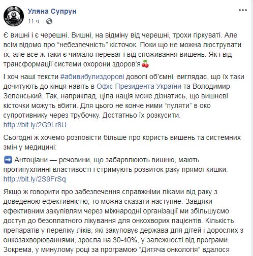 "И хотя наши тексты #абивибулиздорові довольно объемны, похоже, что их таки дочитывают до конца даже в Офисе президента и Владимир Зеленский. Так, например, целая нация может узнать, что вишневые косточки могут убить. Для этого не обязательно ими "пулять" в глаза противнику через трубочку. Достаточно их раскусить", - добавила она.