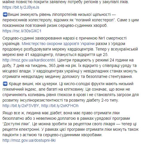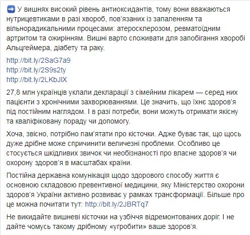 "Вишни стоит употреблять для предотвращения болезни Альцгеймера, диабета и рака", - отметила и.о. министра. Супрун провела параллели в медицинском обеспечении: МОЗ увеличивает доступ к бесплатному лечению для онкобольных пациентов, развивает сеть кардиоцентров, обеспечивает бесплатные или доступные лекарства для диабетиков
