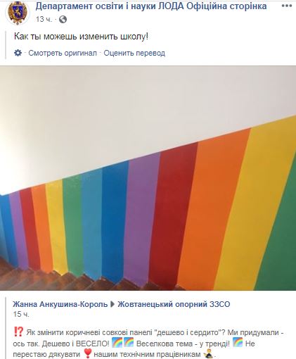 "Как изменить коричневые совковые панели "дешево и сердито"? Мы придумали - вот так. Дешево и весело! Радужная тема - в тренде! Не перестаю благодарить наших технических работников", - говорится в сообщении Жовтанецкого опорного ЗЗСО. Департамент образования и науки Львовской ОГА распространяет эту фотографию с подписью "Как ты можешь изменить школу!".