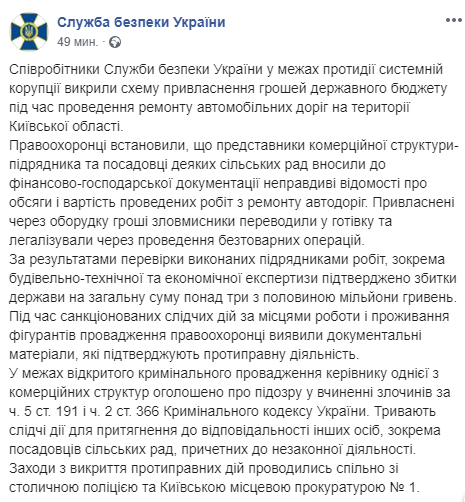В Киевской области сотрудники СБУ выявили хищение более 3,5 миллиона гривен на ремонте автодорог. Об этом спецслужба сообщает на своей странице в соцсети.