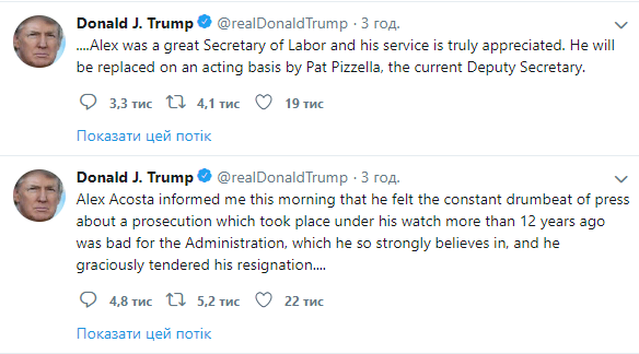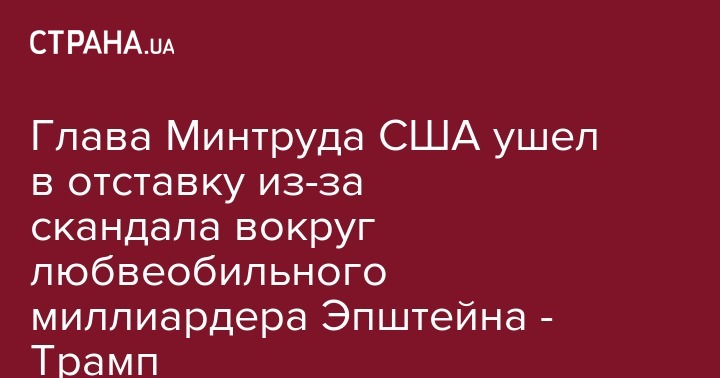 Глава Министерства труда США Александр Акоста подал в отставку из-за последствий скандала вокруг попавшего под суд финансиста Джеффри Эпштейна. Об этом сообщил президент США Дональд Трамп в Твиттере.
