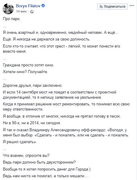 Дорогие друзья, пари заключено. И если 14 сентября мост не поедет в соответствии с проектной документацией, то я напишу заявление на увольнение. Когда я принимал решение мост ремонтировать, то понимал всю свою меру ответственности. Я вообще, в отличие от многих, никогда не прятал голову в песок. Ни в 90-х, ни в 2014, ни сегодня. Я так и сказал Владимиру Александровичу офф-рекордс: "Володя, у меня был выбор: "Сделать - и пожалеть, или не сделать - и пожалеть. Я решил сделать.