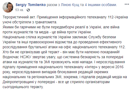 Глава Национального союза журналистов Украины Сергей Томиленко потребовал от силовых структур немедленно расследовать ночной обстрел из гранатомета канала 112 Украина.