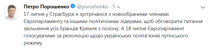 "17 июля в Страсбурге я встречаюсь с новоизбранными членами Европарламента и другими политическими лидерами, чтобы обсудить вопрос освобождения всех заложников Кремля из плена", - написал Порошенко в Twitter.