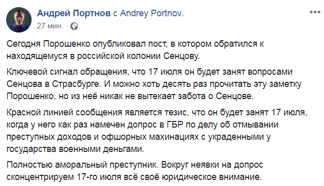 Также Портнов отметил, что в сообщении Порошенко не читается сочувствие к Сенцову.