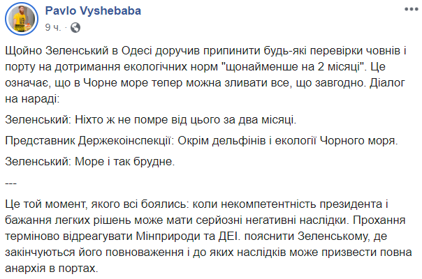 Активист ПРООН Павел Вышебаба пишет в Facebook, что Зеленский потребовал в Одессе, чтобы экологи два месяца не проверяли порты на предмет загрязнений.