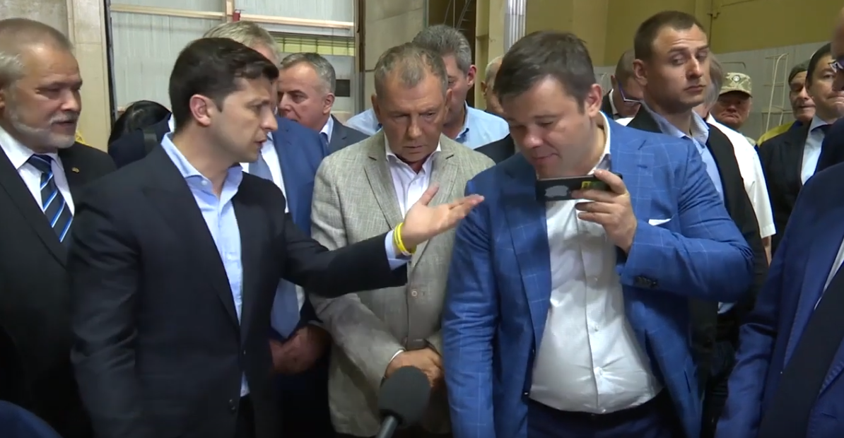 В этот момент Богдан, не дав Зеленскому договорить, забрал телефон и начал рассказывать мэру суть тендерного вопроса. Президент сделал жест рукой с требованием отдать телефон, но глава АП проигнорировал его.