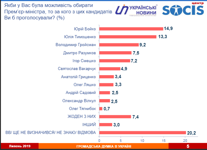 5-9 июля 2019 года социологи провели опрос на предмет премьерских симпатий украинцев. Если бы можно было выбирать главу Кабинета Министров, 14,9% респондентов предпочли одного из лидеров "Оппозиционной платформы - За жизнь" Юрия Бойко. Чуть меньше голосов (13,3%) получила Юлия Тимошенко. На третьем месте в рейтинге симпатий находится Владимир Гройсман (9,2%).
