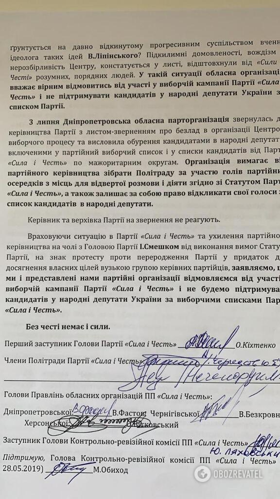 В партии Игоря Смешко "Сила и честь" продолжается крупный скандал, связанный с тем, что первые места в списке на внеочередные парламентские выборы 2019 года были проданы полностью "чужим" людям, которые никакого отношения к ней ранее не имели, пишет Обозреватель.
