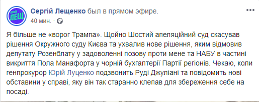 "Я больше не "враг Трампа". Только Шестой апелляционный суд отменил решение Окружного суда Киева и принял новое решение, которым отказал депутату Розенблату в удовлетворении иска против меня и НАБУ в части разоблачения Пола Манафорта в черной бухгалтерии Партии регионов", - написал Лещенко.